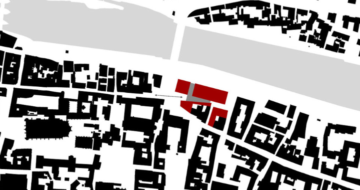 | Neubau Museum der Bayerischen Geschichte - MdBG Wettbewerbsbeitrag, mit Inga Soll Der Grundriss des Foyers bildet den historischen Gassenverlauf des Quartiers ab, wobei die beiden Haupteingänge des Museums der Donau und der Altstadt zugewandt sind. Die aus der Altstadt kommende Straße Unter den Schwibbögen führt direkt in den neuen Stadt- Eingang des Museums und wird als Gasse durch das Gebäude hindurch geführt. |